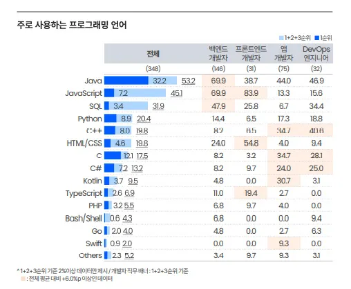 Java는 국내 기업 특히 서버 개발과 관련해서는 확고한 입지를 가지고 있습니다. 국내 프로그래밍 언어 점유율 1위가 Java이기 때문에 기업에서도 가장 많이 개발에 가장 많이 채택하는 언어이며, 채용도 가장 많이 열리는 언어입니다.